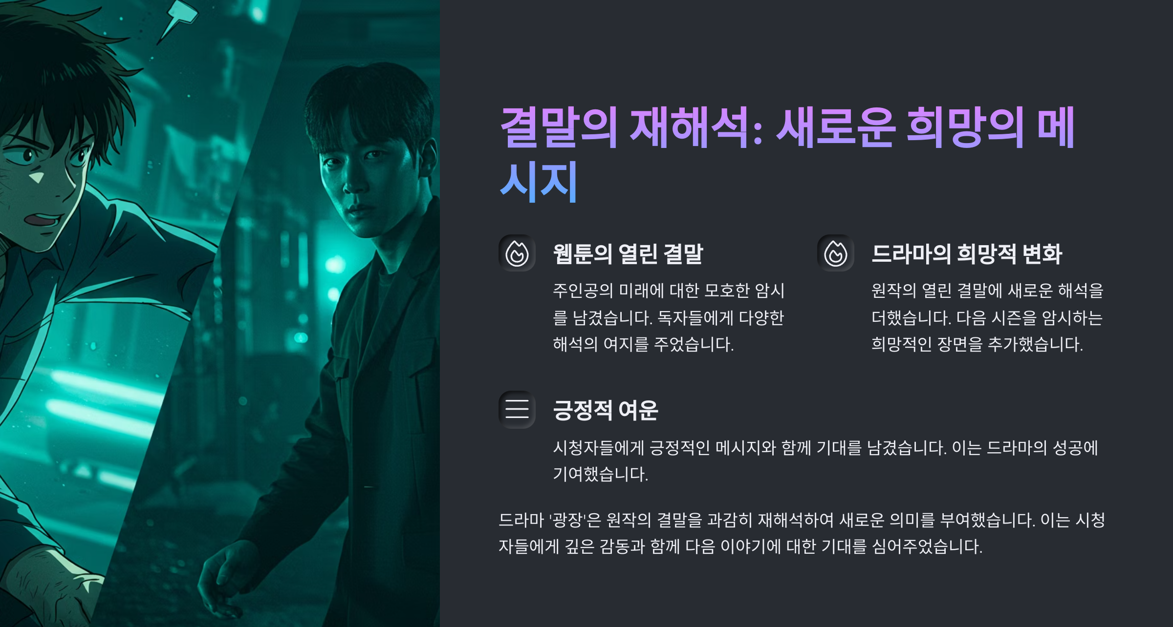 개인적으로 '광장' 드라마는 두 그룹의 기대를 모두 충족시키기 위해 노력한 흔적이 보였습니다. 웹툰의 핵심적인 스토리와 캐릭터는 유지하면서도, 드라마적 연출과 서사적 확장을 통해 대중적인 매력을 더하려고 한 것 같아요. 특히, 시각적인 액션 연출은 드라마의 큰 강점이었고, 이를 통해 새로운 시청자들을 사로잡는 데 성공했다고 봅니다.
