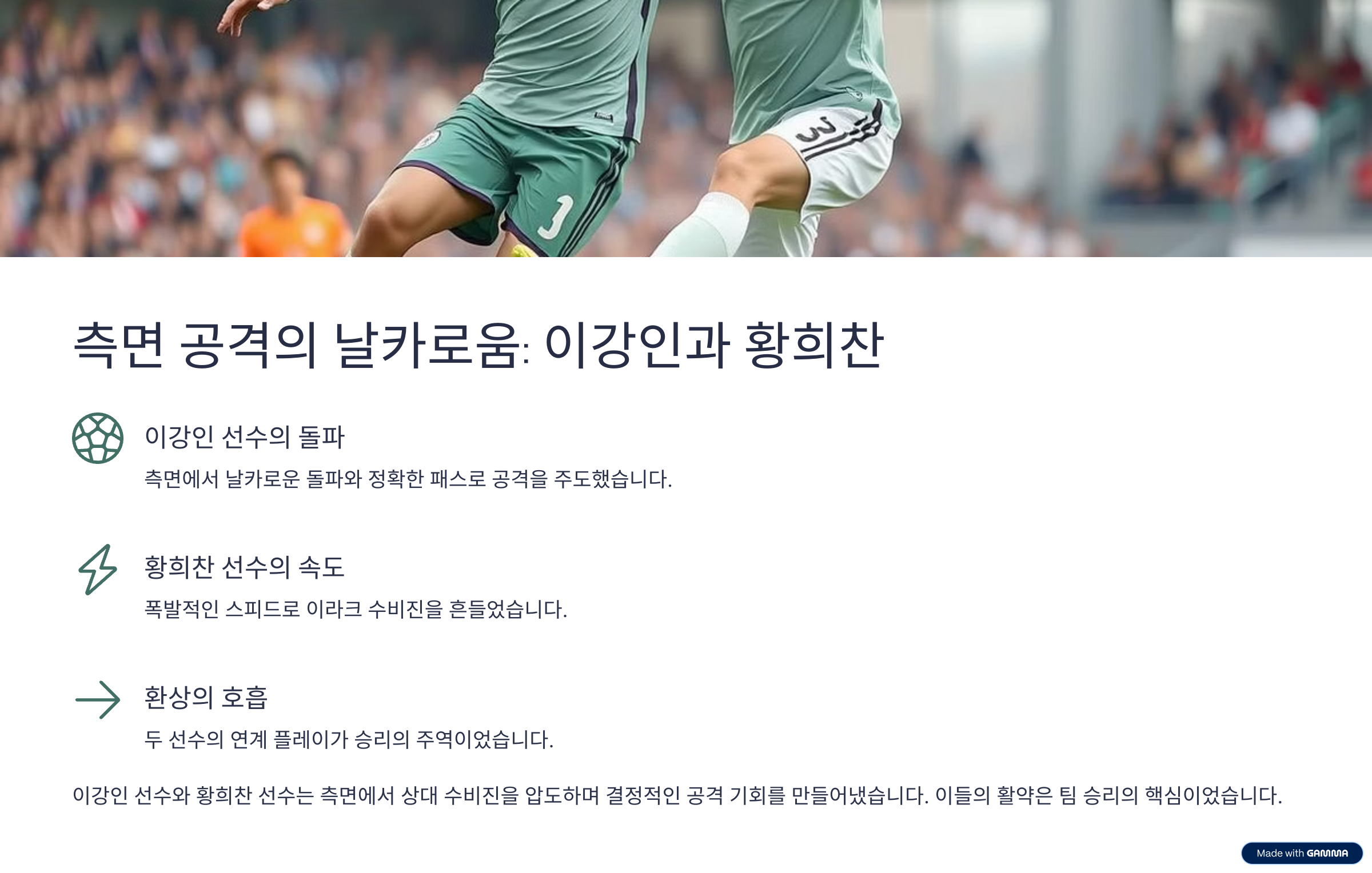 특히 이번 경기에서는 부상으로 출전 명단에서 제외된 손흥민 선수 대신, 이재성 선수가 주장 완장을 차고 중원에서 맹활약하며 팀을 이끌었어요. 이강인 선수와 황희찬 선수도 측면에서 날카로운 공격을 주도하며 이라크 수비진을 흔들었답니다. 우리 선수들, 정말 다들 멋졌어요!