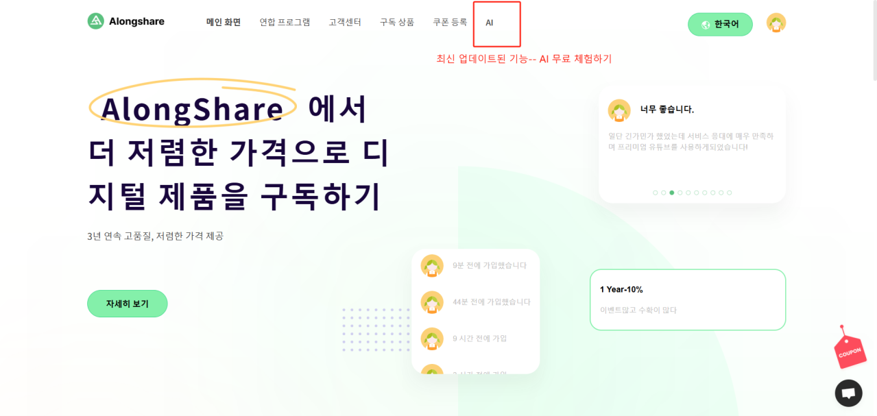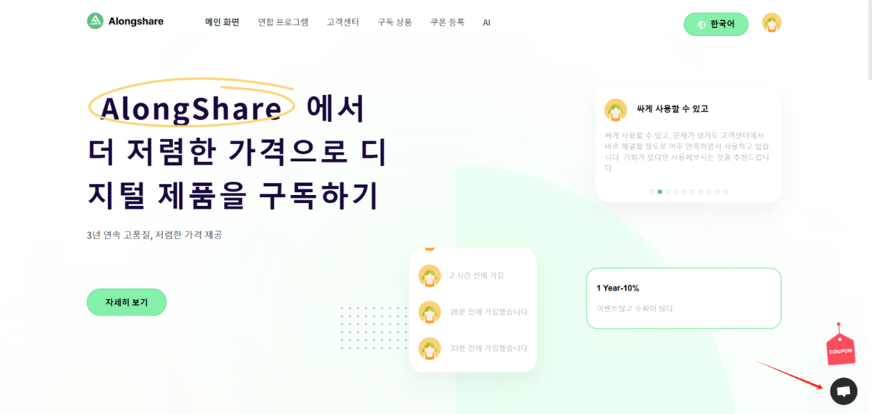 ▶ 여기서 하나 더! 10% 할인코드를 어롱쉐어(Alongshare) 가입 시 추가로 할인을 받을 수 있습니다.