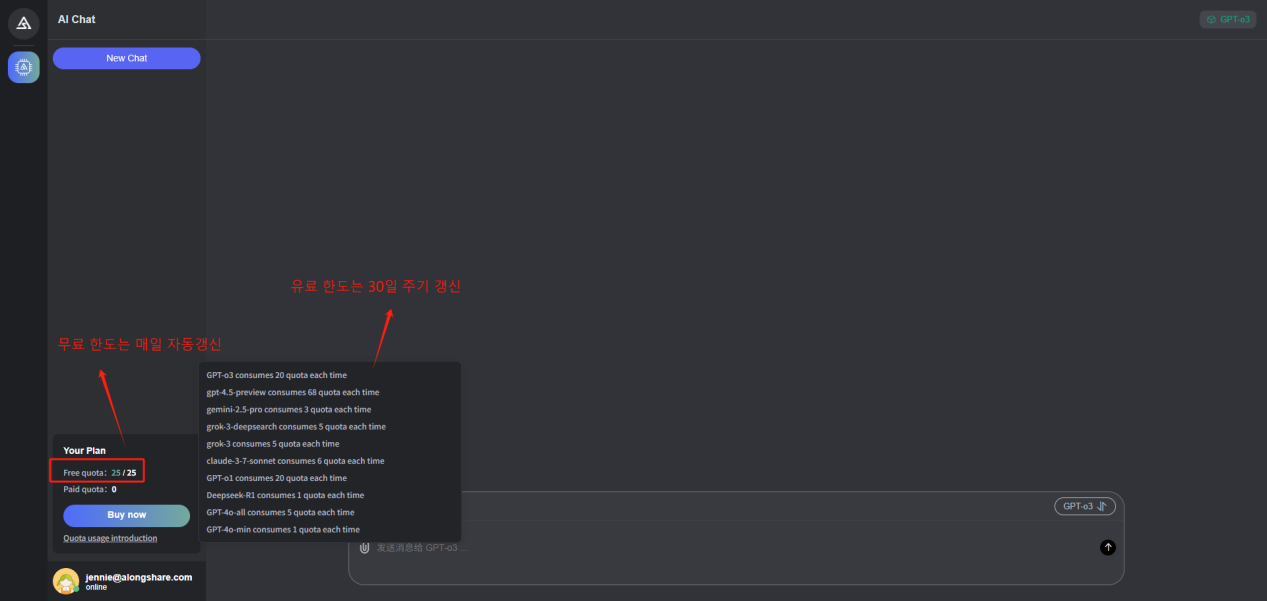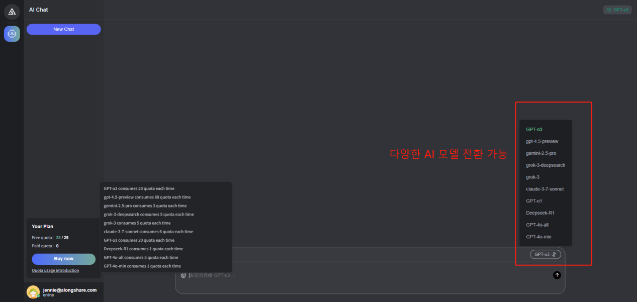 재밌는 서비스가 있어 소개해 드립니다. 각 생성형 AI 서비스 회사의 API를 연동해 어롱쉐어(Alongshare)에서 하나로 모아 제공하는 서비스를 하고 있습니다. Grok3, ChatGPT 4o, o1, o3, Claude 3.7, R1 등 회원 가입 후 매일 주는 무료 크레딧(25크레딧)으로 이용할 수 있습니다.