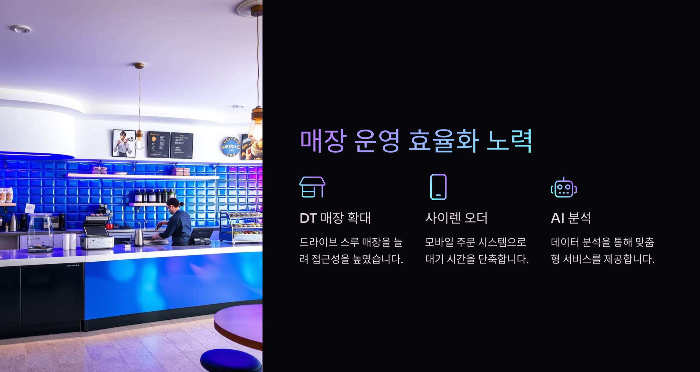 A: 푸드 메뉴 강화, 드라이브 스루 및 딜리버리 서비스 확대, 멤버십 혜택 강화, 친환경 정책 추진 등 다양한 방면에서 변화를 꾀하고 있습니다.