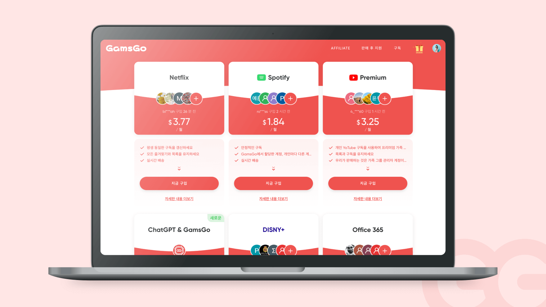 "어롱쉐어(Alongshare)가 넷플릭스(Netflix)와 유튜브(YouTube) 프리미어에 특화된 중개 플랫폼이라면 겜스고(Gamsgo)는 다양한 서비스를 제공하는 곳 입니다."